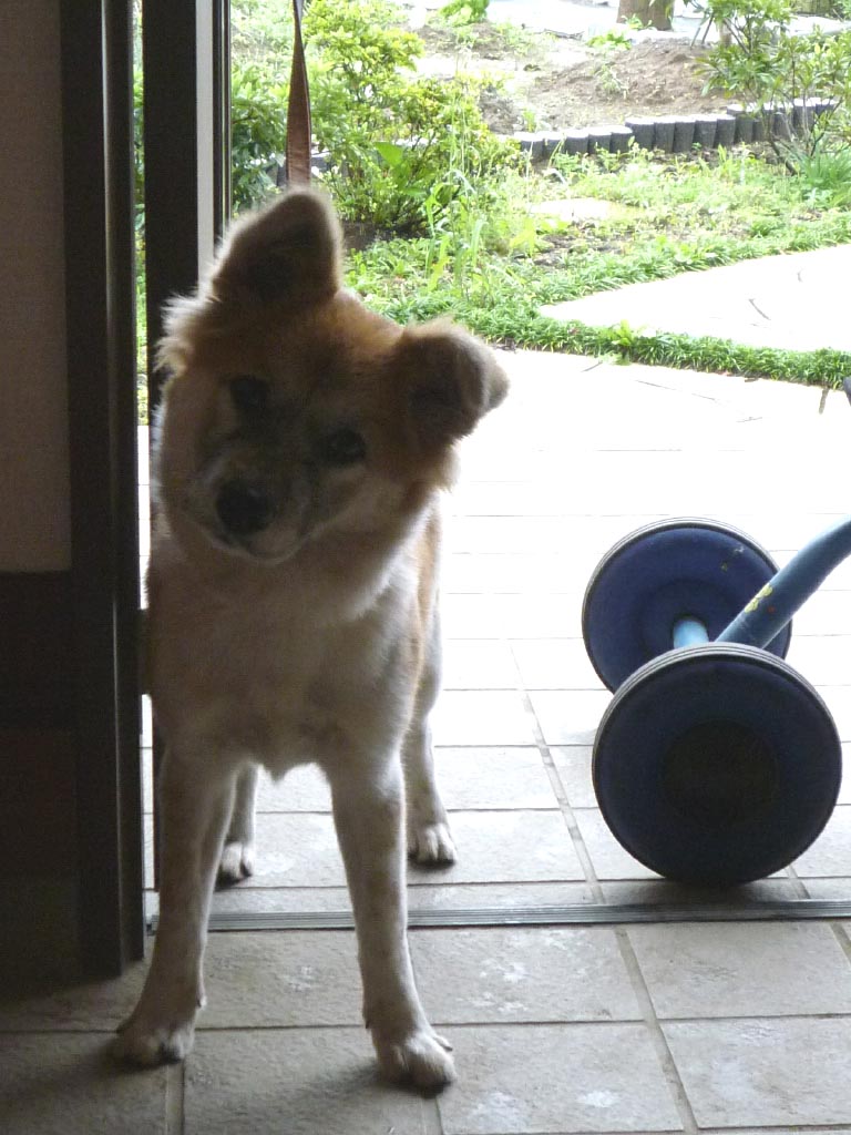 突風が吹き荒れました。ぼたんは玄関で居座っています。