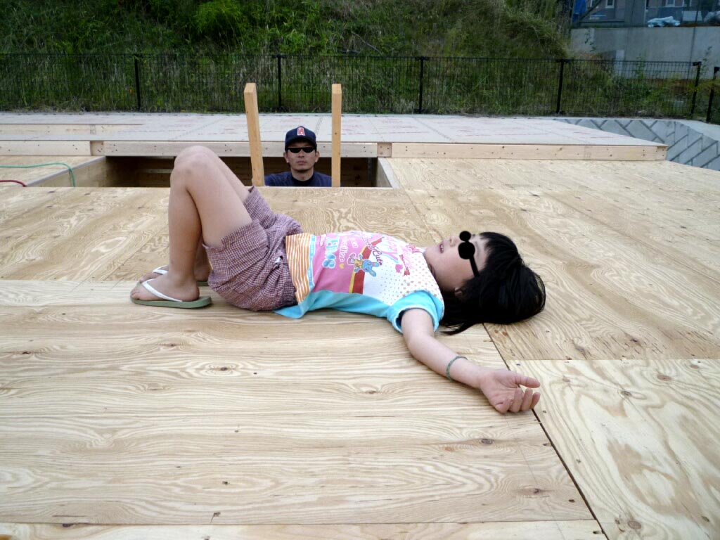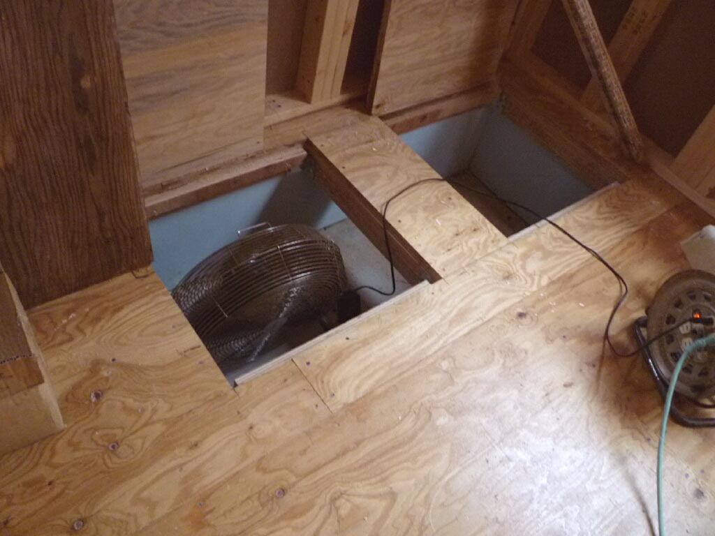 床下収納をあけ大きな扇風機を基礎内に向けてゴーゴー風を送ってます。