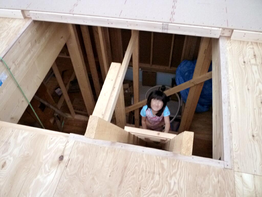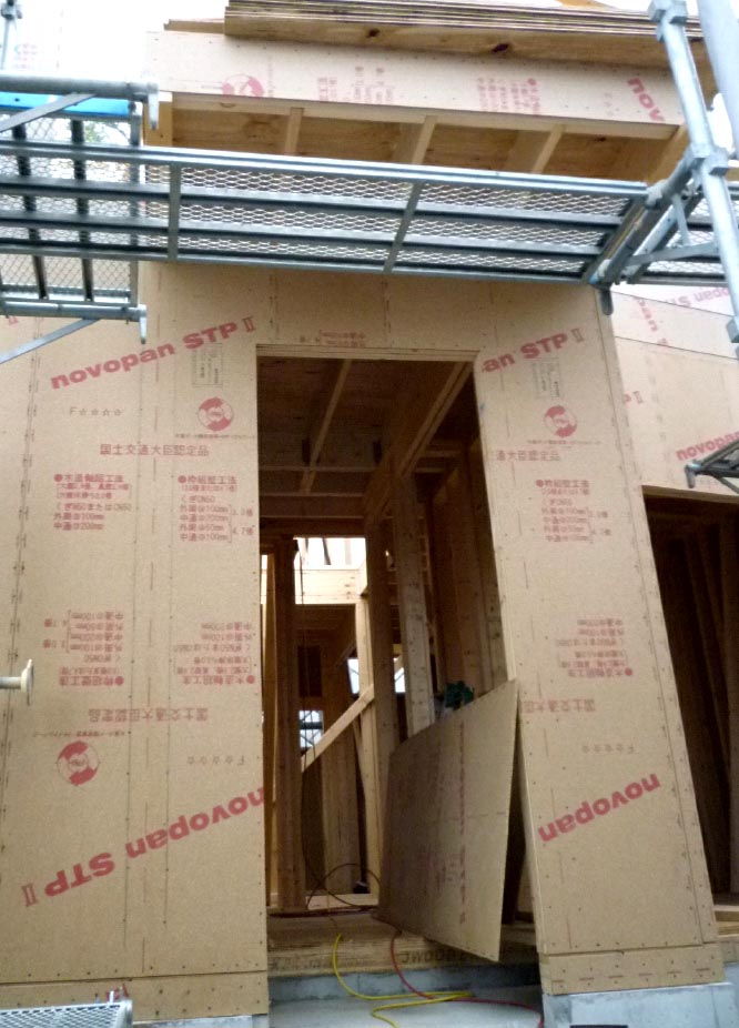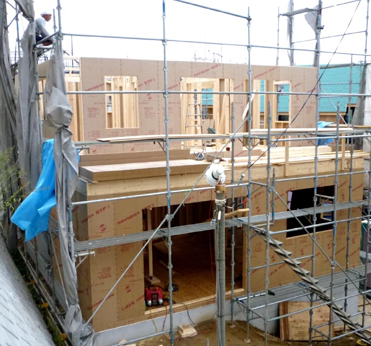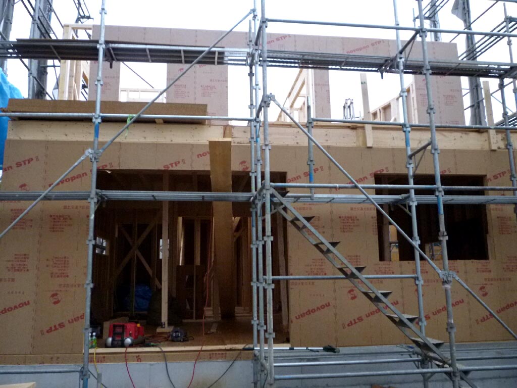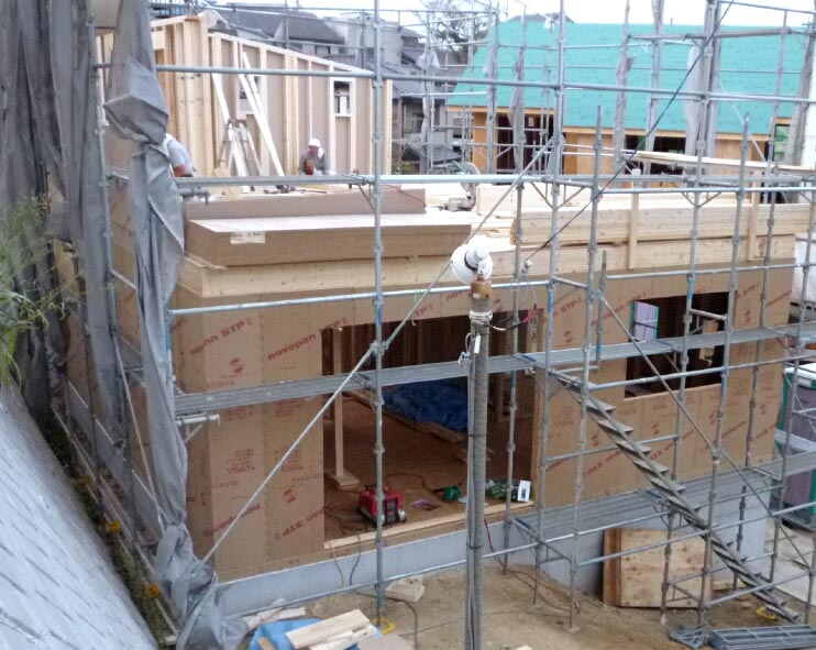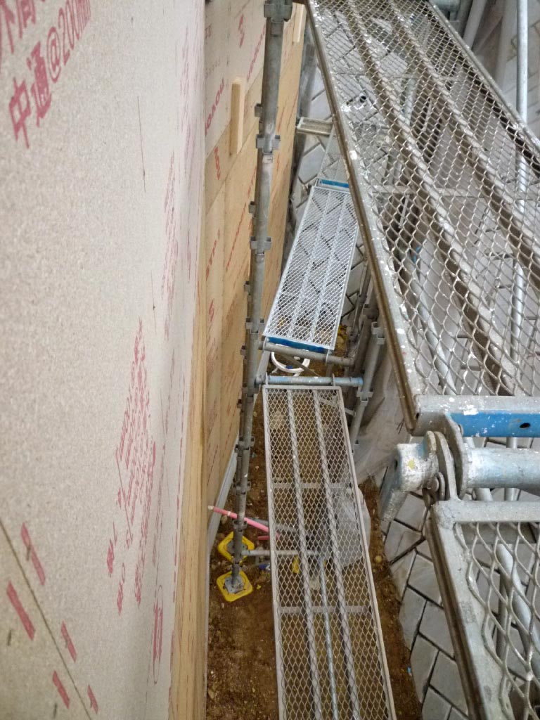 2階から見下ろした不思議な角度の壁は足場も角度がこうなります。