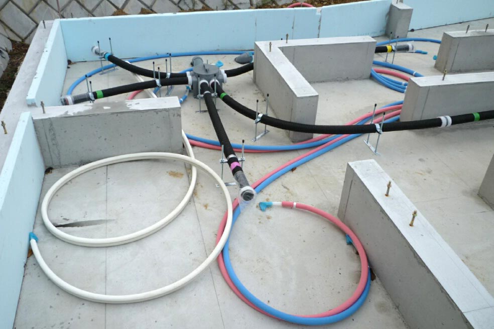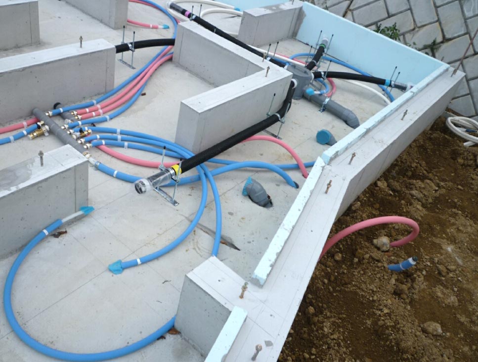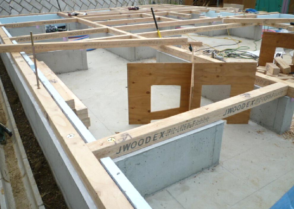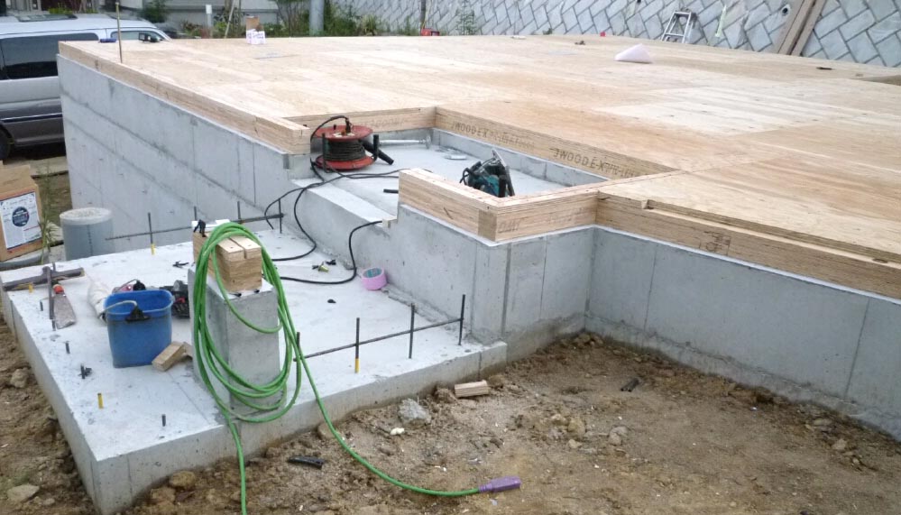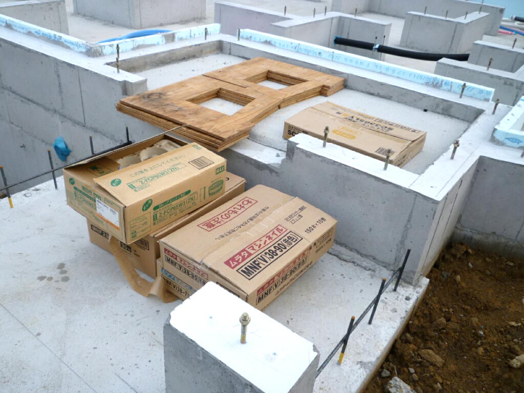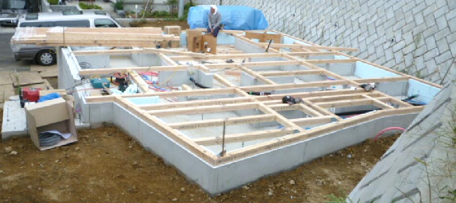 基礎と平行したスタイロフォームと根太を組む為にできた隙間を