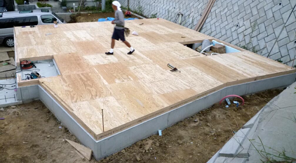 しかし日中は天気回復。そんな中、床ベニヤ板が敷き詰められました。