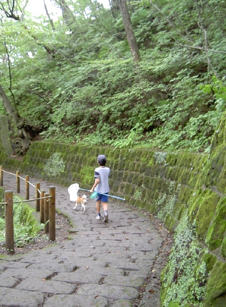 緑色のコケがびっしりの石垣遊歩道が美しい色彩です。